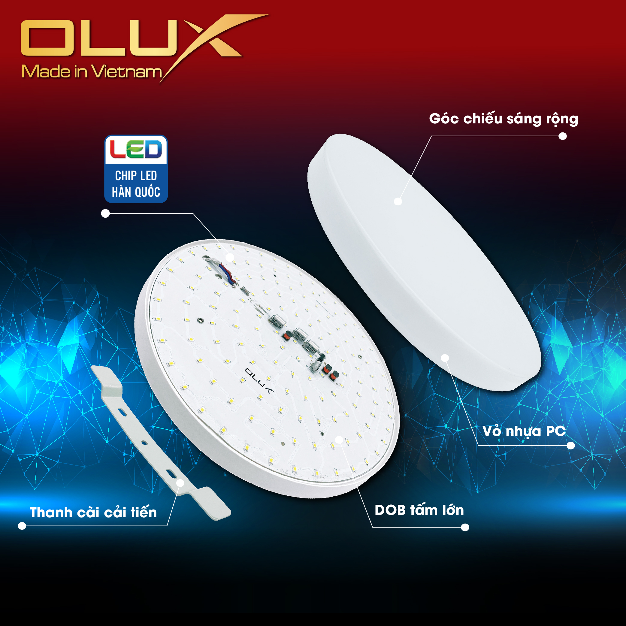 - Thiết kế thanh cài cải tiến (độc quyền OLUX), chỉ xoay nhẹ là dễ dàng cố định sản phẩm lên trần, tường, giúp khách hàng dễ dàng thi công lắp đặt.